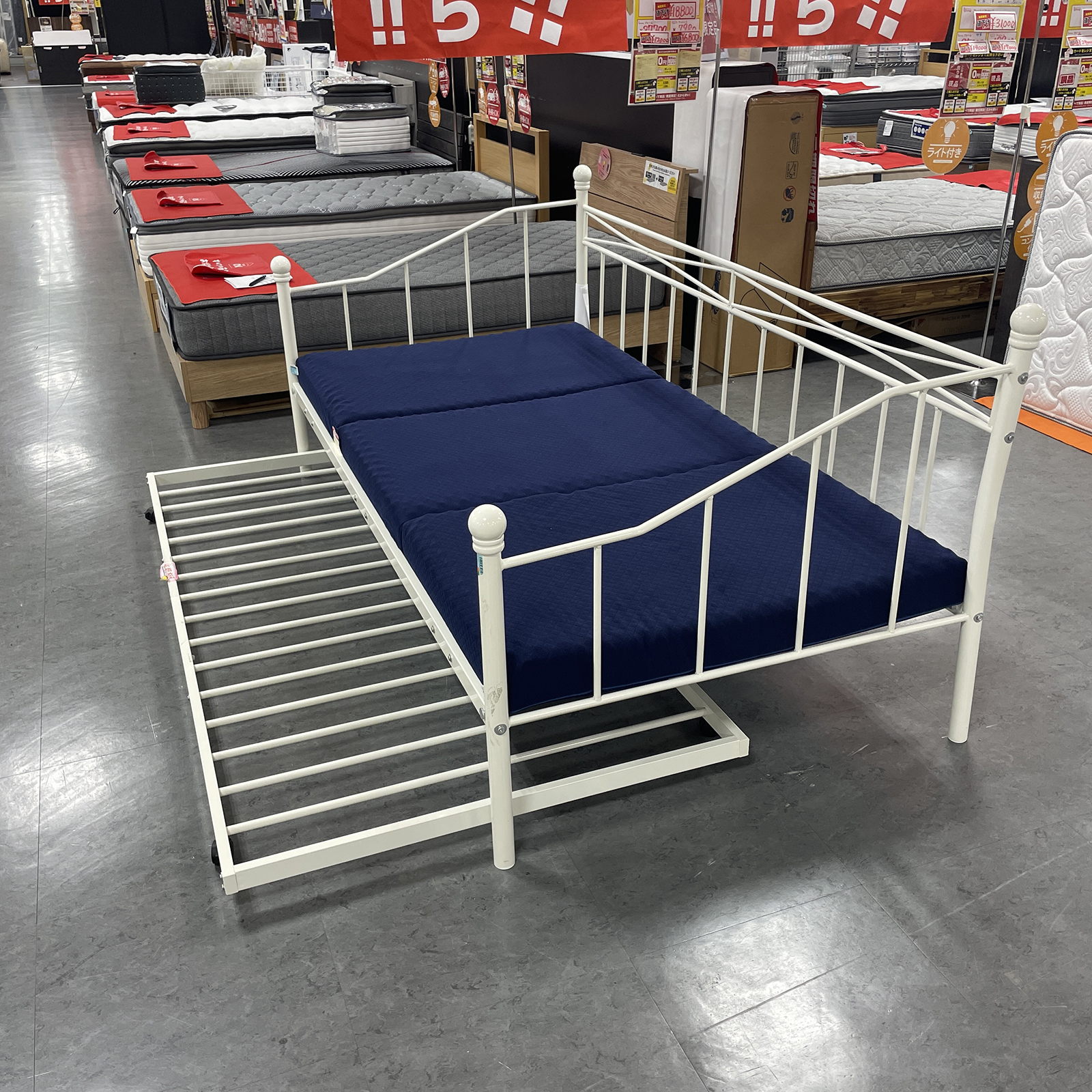 棚板と3つ折りマットレスが付いたお買い得なシングルベッド!工場直送だからもともとお得な商品がさらにお手頃価格になっています♪ベッド下にはちょっとした物を置ける棚板付きで、使いやすさも◎
