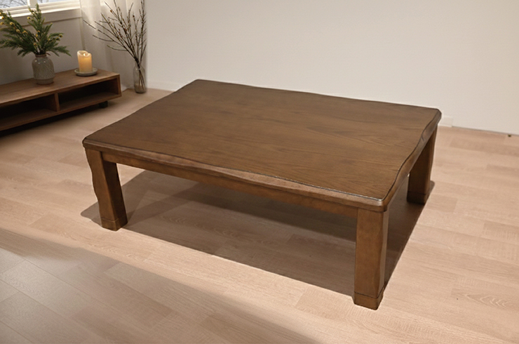 木目の美しい天板と丸みのあるデザインが上質なこたつ。薄型ヒーターで足元までムラなくあたたかく、手元コントローラーで操作も簡単。オフシーズンはローテーブルとして一年中使えます。